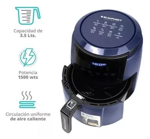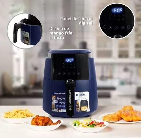 Características: -Freidora eléctrica de aire -Potencia 1500W -Touch Control Panel -Display digital -Multi-programa -Temporizador digital -Cestillo de fritura removible Antiadherente -Botón de cierre seguro -Manija para manipular -Cuerpo frío al tacto -Uso fácil -Soportes de alta estabilidad -Capacidad total 4.5L