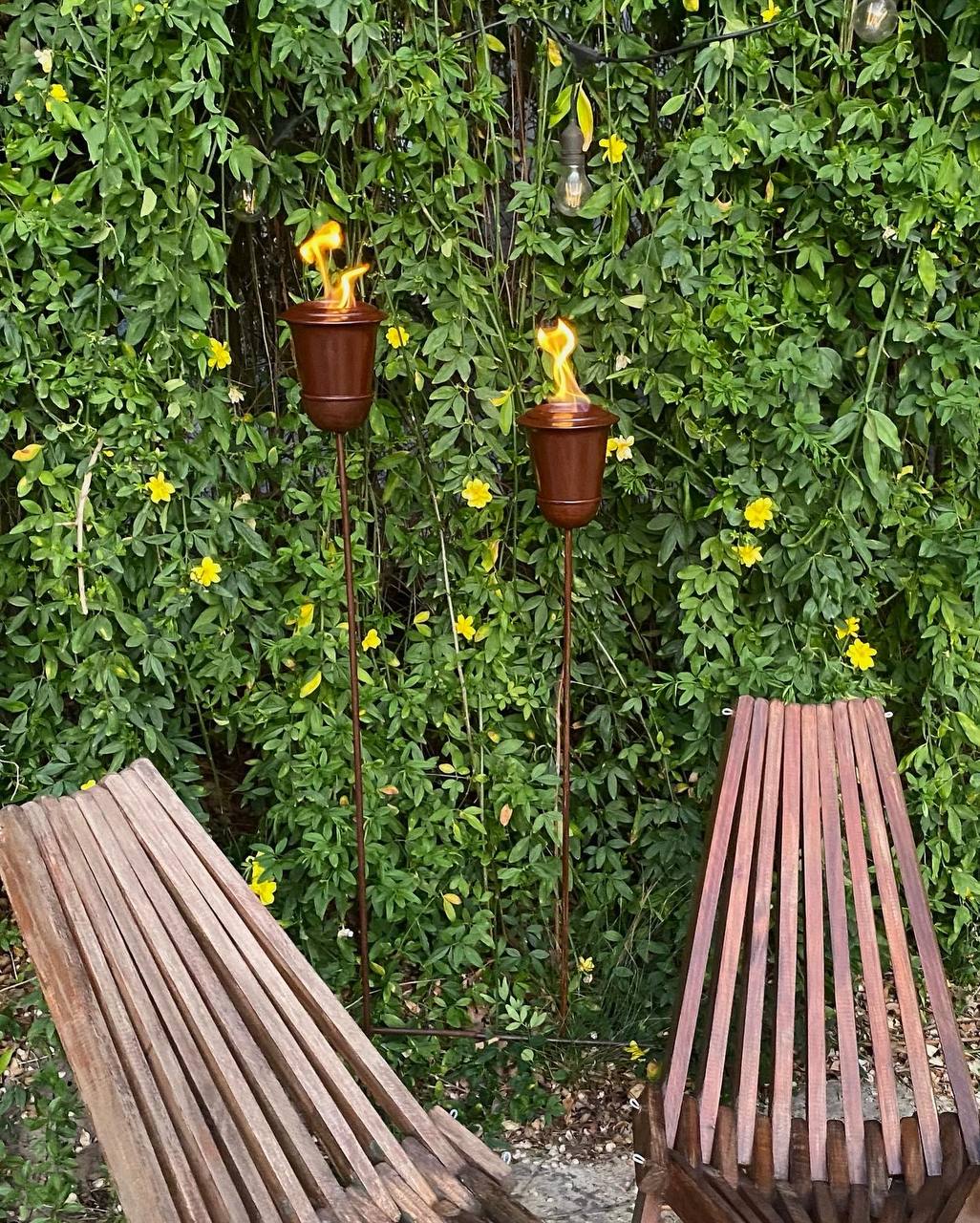 Incluye tutor, quemador y tapa apagadora. El quemador es removible y mientras no esté en uso debe guardarse bajo techo, mientras el soporte puede quedar a la intemperie.