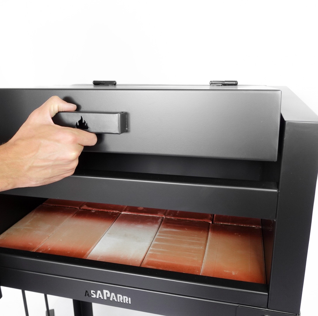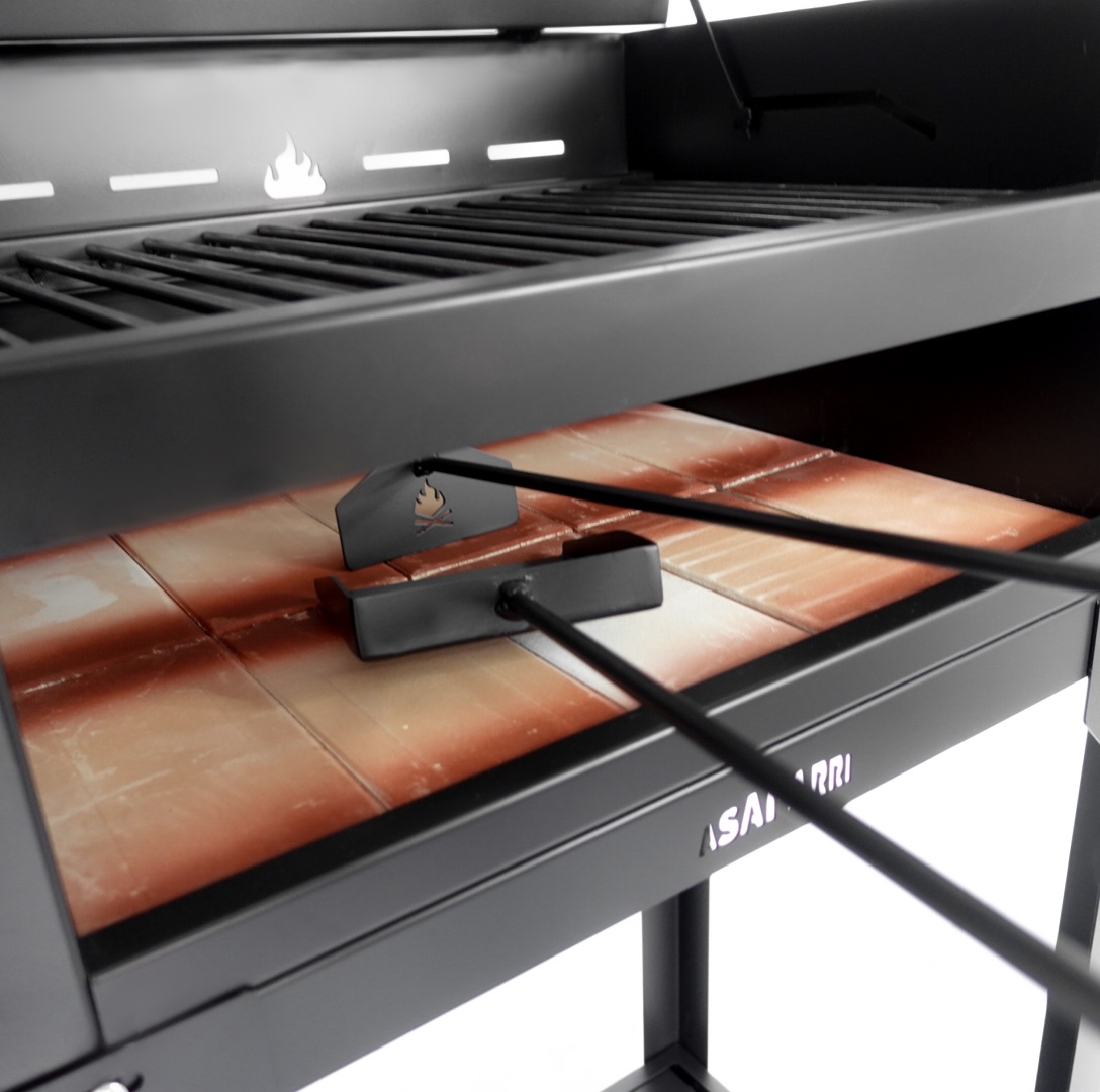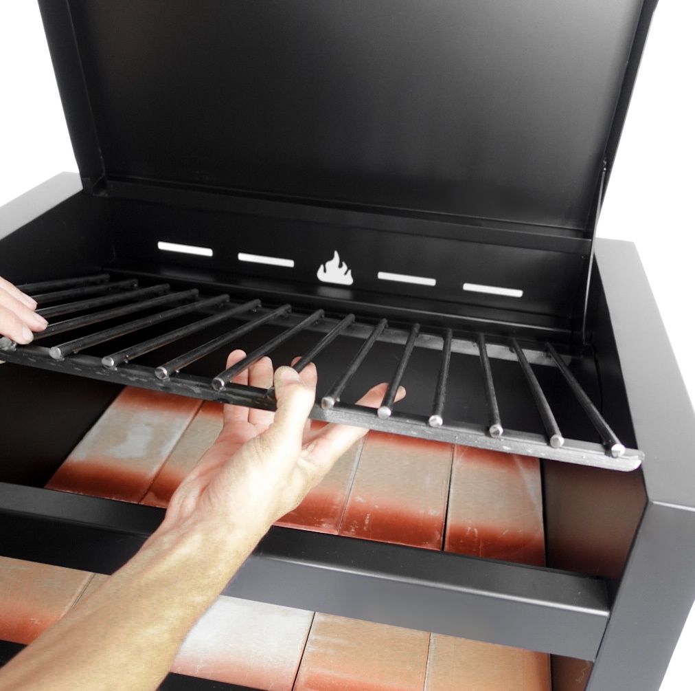 Esta parrilla no incluye brasero, ya que su tamaño esta optimizado para lugares chicos y para cocinar con poco fuego (gracias a la tapa y los ladrillos refractarios). Para su funcionamiento tenes que sacar el enrejado, prender el carbón, poner el enrejado y cocinar con el fuego ya encendido.