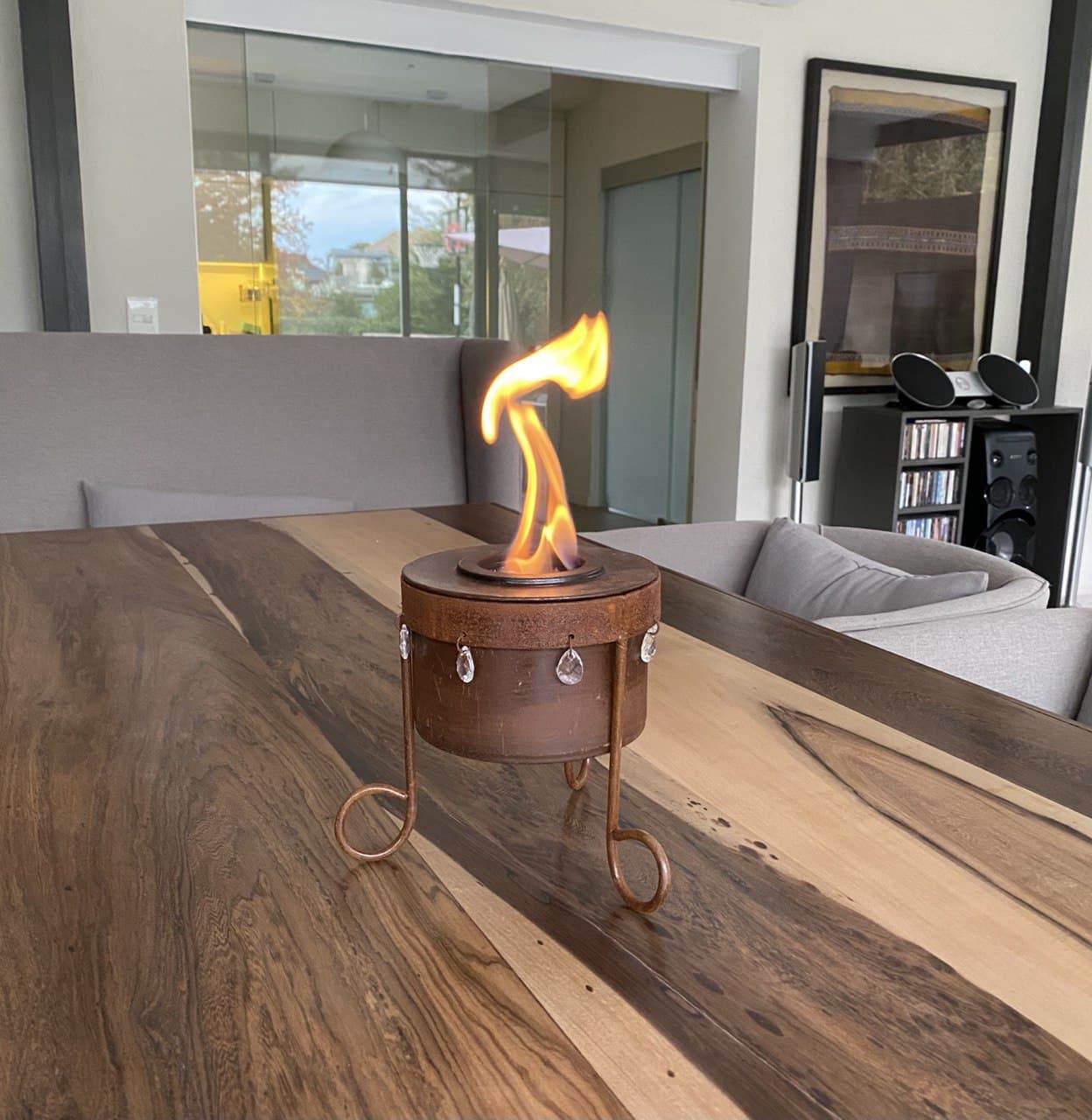 Incluye el pie, caireles, quemador de 16cm de diámetro y tapa apagadora. Puede colocarse sobre cualquier superficie (vidrio, madera, plástico). Disponible en color Oxido.