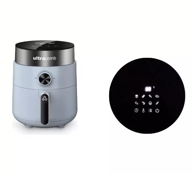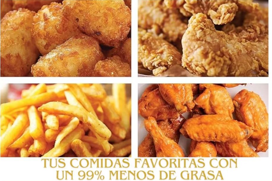 Freidora con aire caliente a alta velocidad y temperatura constante que fríe sin nada o muy poco aceite y consigue unas frituras mucho mas saludables, con un menos 99% de grasa y un resultado crujiente y sabroso.