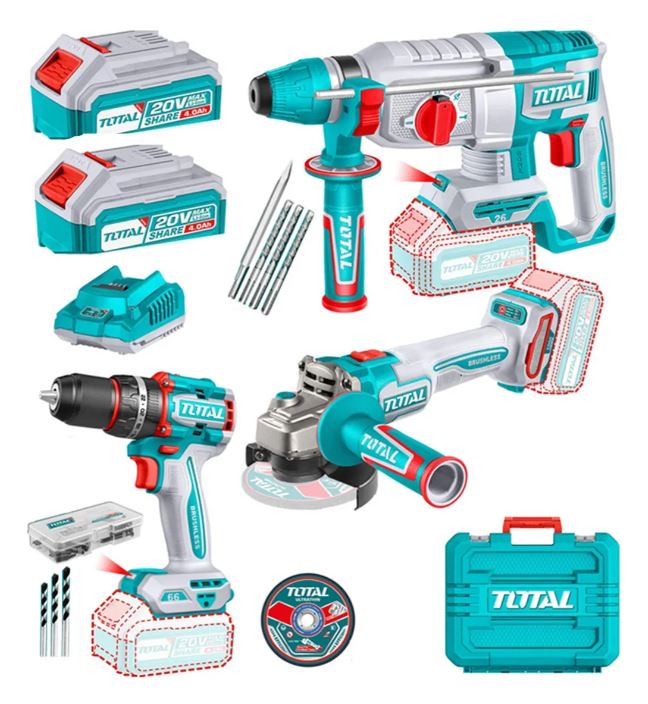 **INCLUYE:** - 47 Accesorios - 3 Brocas - 10 Discos de Corte - 2 Baterías de 4 Amp - 1 Cargador