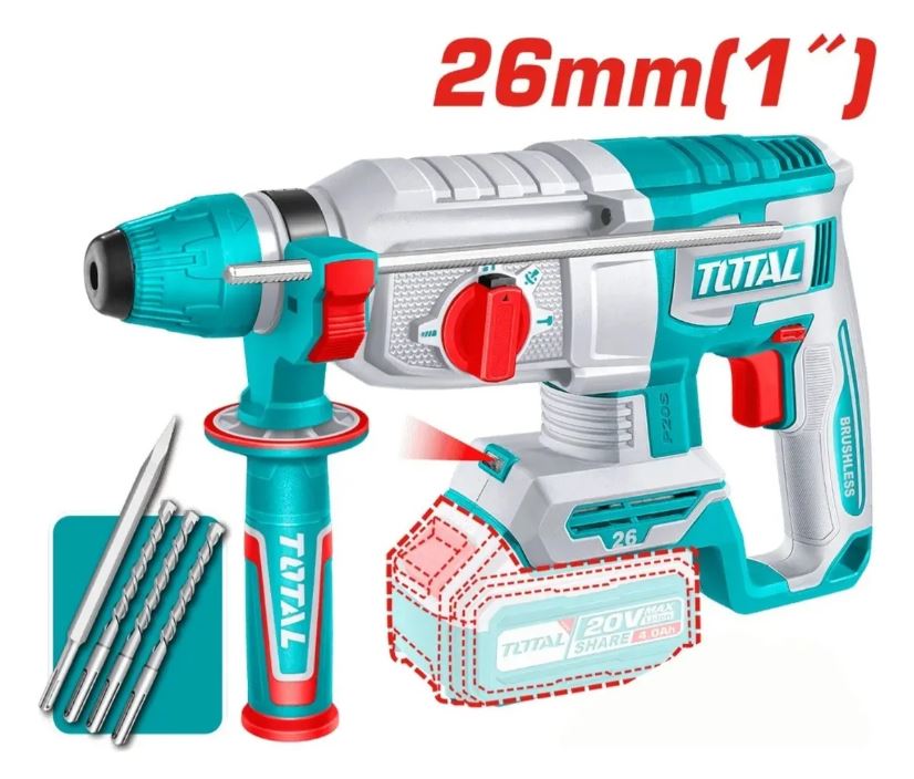 Fuerza de impacto: 2,5 J - Capacidad máxima de perforación: - Hormigón: 26 mm - Acero: 13 mm - Madera: 30 mm.