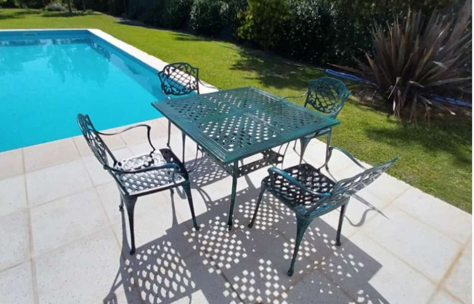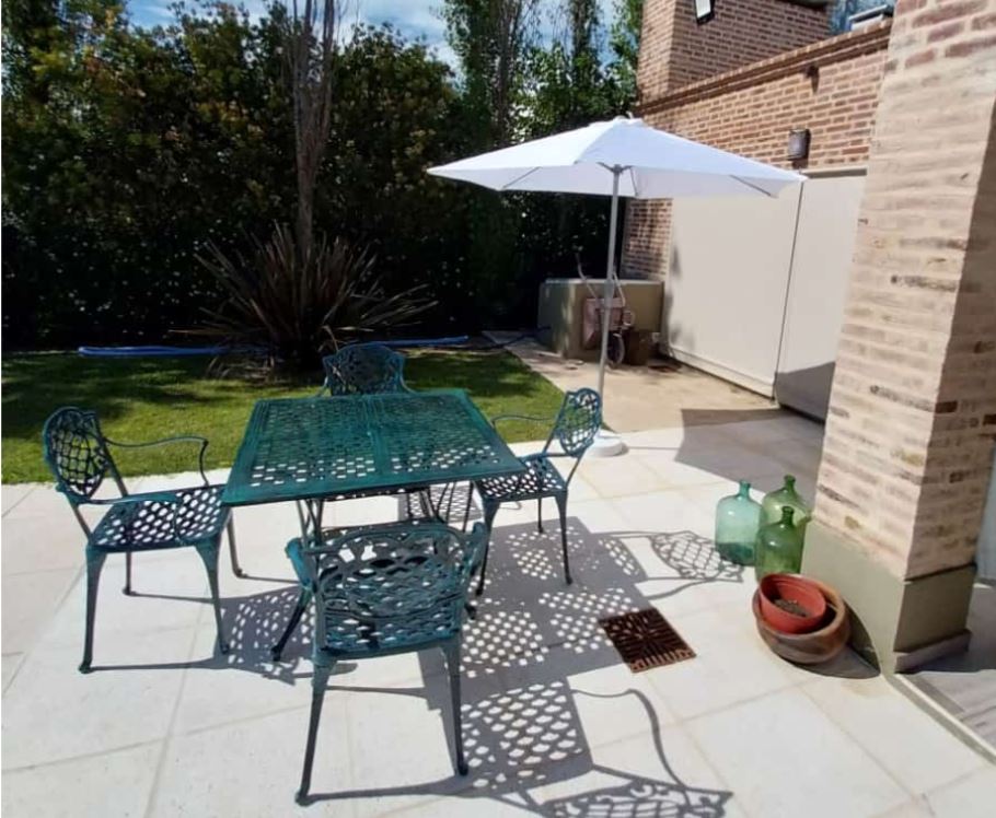 Medidas: la mesa mide 1 x 1 mt x 73 cm de alto aproximadamente. Las sillas miden 43 cm de ancho x 84 cm de alto aproximadamente.