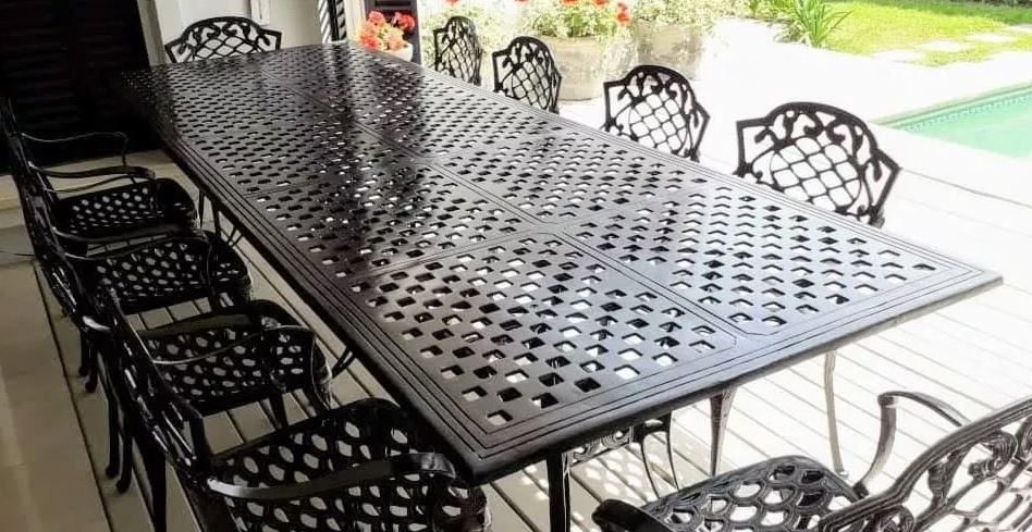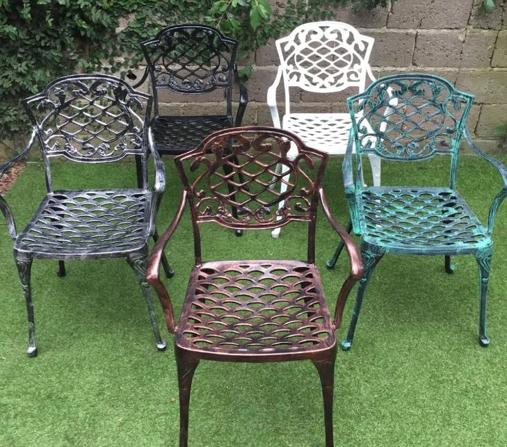 Colores: blanco, negro, patinas: en verde, en aluminio, óxido y bronce viejo. Usos: interior o exterior, no se oxida. Es un juego cómodo que puede entrar en cualquier lugar de la casa o jardín y liviano para transportar.