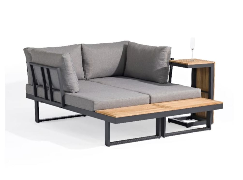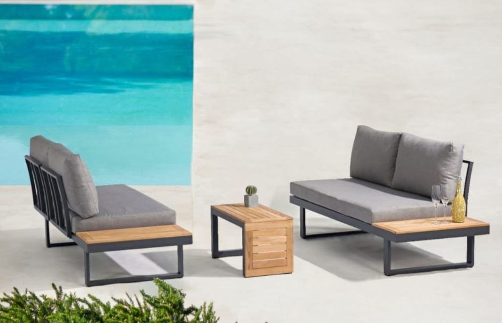Set de living para exterior fabricado con estructura de aluminio color grafito combinado con madera de Acacia y almohadones en tela poliéster.