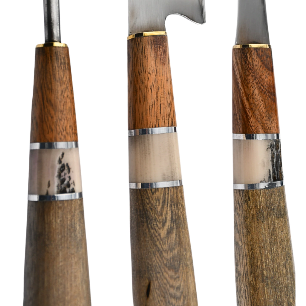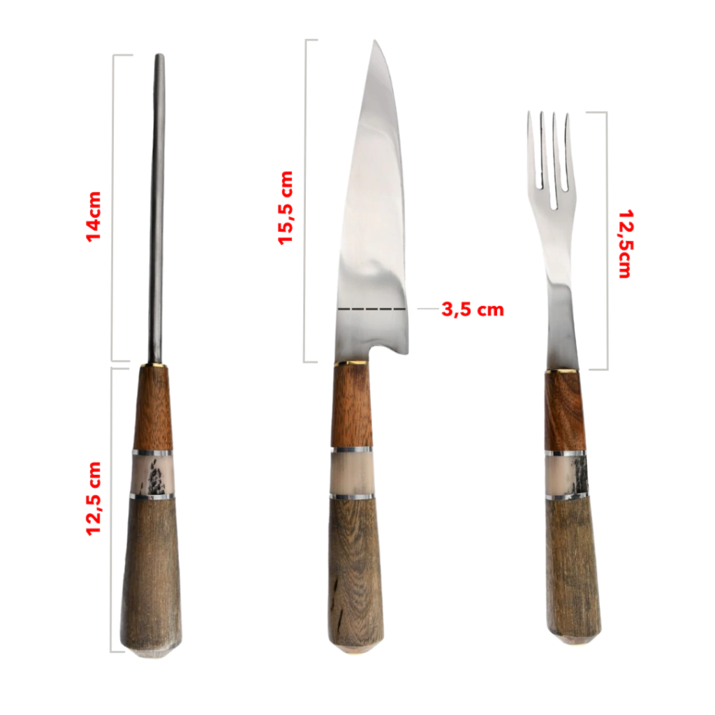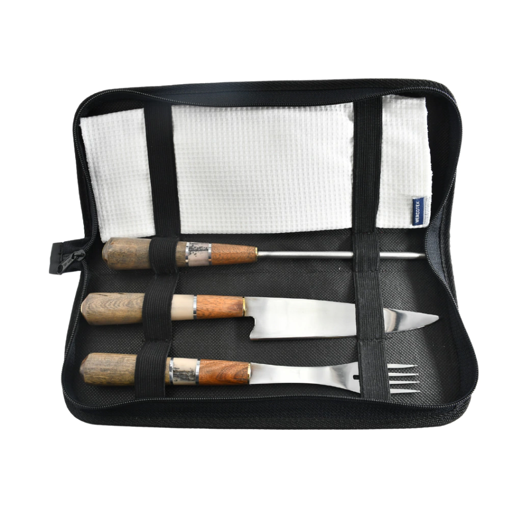 Compuesto de cuchillo, tenedor, chaira, servilleta de tela y estuche de cuero para transportarlo.