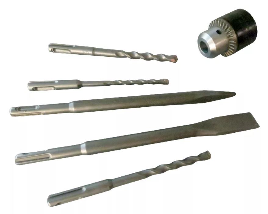1 llave de mandril, 1 mandril, 1 mango lateral, 1 medidor de profundidad, 2 cinceles, 3 mechas, Maletín